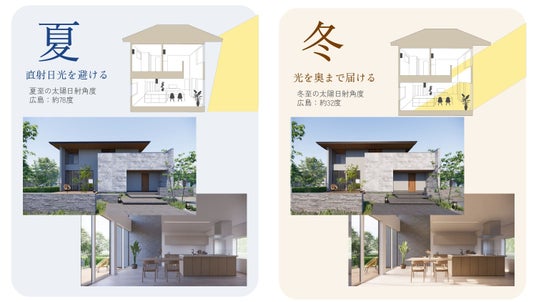 深い軒(のき)で夏の日差しを遮り、冬は暖かい陽光を室内に招き入れる。そんな自然の力を巧みに利用する思想を取り入れました。季節の移ろいを感じながら、エネルギー効率よく快適に暮らせる機能美をデザインに昇華させています。