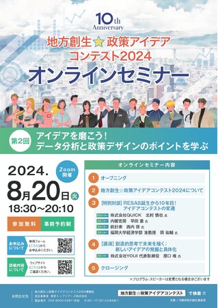 「地方創生☆政策アイデアコンテスト2024」に向けて、第2回セミナーをオンライン(Zoomウェビナー)にて2024年8月20日(火)に開催します。
