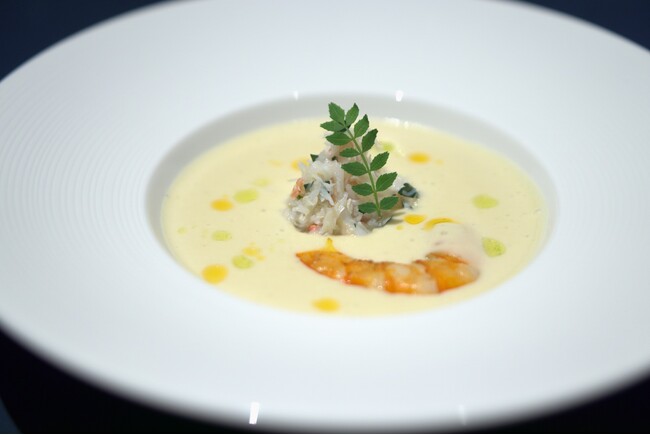 【スープ】スモークをかけたじゃがいもの温かいビシソワーズ 帆立、カニ、海老
