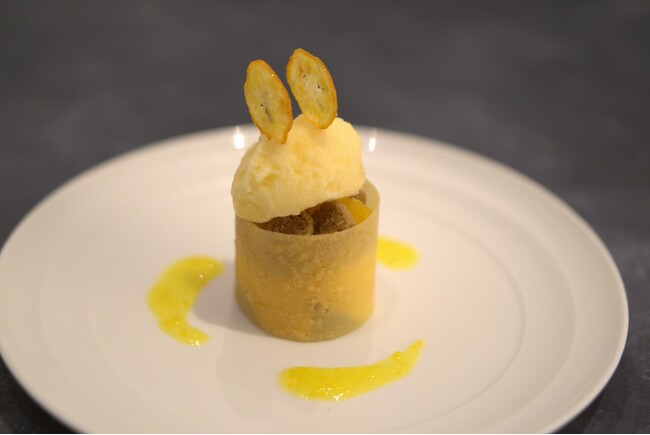 デザートは、今が旬のデコポンを今年の干支「兎」に見立てた可愛いコンポート。香りのよいデコポンのソースに、レモンクリーム、デコポンの果実味溢れるソルベ、最後にくるっと一周させたのはパリッとした食感が楽しいオレンジ風味のチュール。柑橘四重奏をお楽しみいただけます。