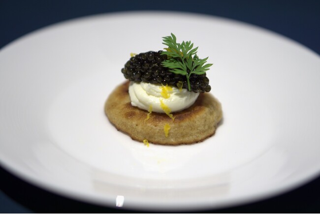【アミューズ】オートミールのブリーニ オシェトラキャビア、サワークリーム、柚子