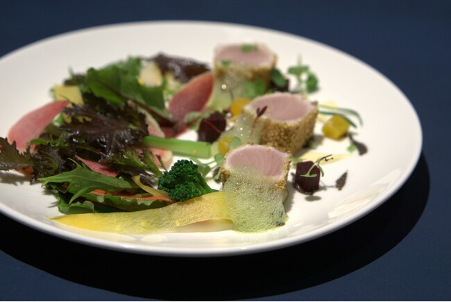 旬の鰤の表面をグリルして旨みをとじ込め、胡麻を纏わせたセサミルーラードを色鮮やかに引き立てるのは、フレッシュなグリーングラスたち。能登半島で作られる伝統的な調味料、いしるをきかせたドレッシングを泡状にしてそっと鰤に寄り添わせました。