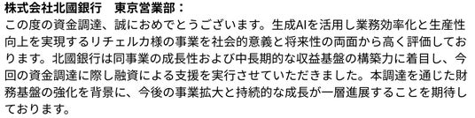 本ラウンドは、新たにAngel Bridge株式会社をリード投資家として迎え、既存投資家である株式会社ジェネシア・ベンチャーズ及びNew Commerce Ventures株式会社、個人投資家からの第三者割当増資に加え、みずほ銀行、商工組合中央金庫、三井住友銀行、りそな銀行、常陽銀行、北國銀行からのデットファイナンスにより実施いたしました。