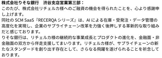 SaaSと比較して役務提供が広範な分、ERPやパッケージビジネスの国内市場は今後も巨大であり続けると信じており、市場の勢力図が大きく塗り替えられるタイミングだと捉えています。同社はその一角を担う存在になると強く信じ、今後も継続的な支援に取り組む所存です。GO RECERQA!