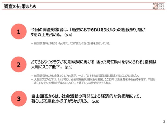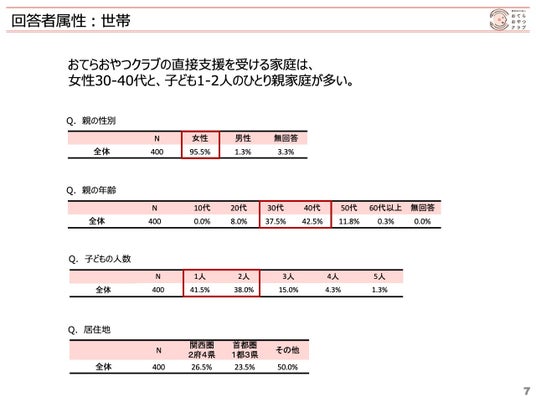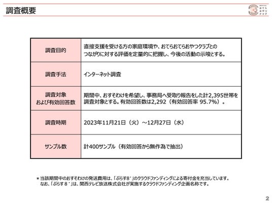 認定NPO法人おてらおやつクラブは、当団体から直接的に支援を受ける世帯を対象にアンケート調査を実施しました。家庭を取り巻く環境や、当団体とのつながりに対する意識・実態を把握し、今後の活動の示唆とするための調査を行い、報告書をまとめましたのでお知らせいたします。(対象世帯数:2,395世帯/サンプル数:計400)
