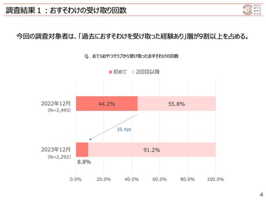 これは、調査を実施した11月~12月の期間中に、1年以上おすそわけを受け取れていない家庭を対象に「冬のおすそわけ2023」という企画を実施していたためです。