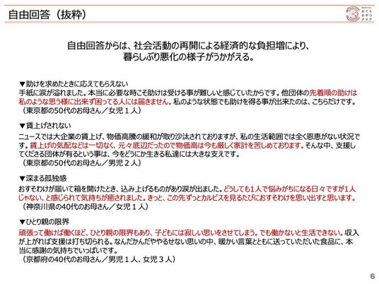 自由回答から、社会活動の再開による経済的な負担増により、暮らしぶりが悪化している様子がうかがえる。