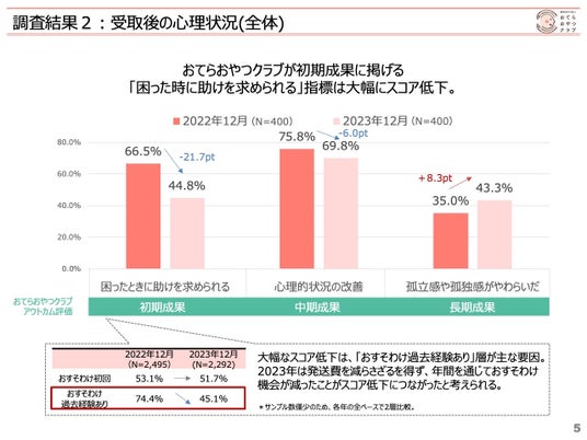 おてらおやつクラブが初期成果に掲げる「困った時に助けを求められる」指標のスコアが大幅に低下。