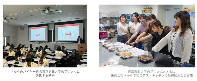 2023年6月東京家政大学の学生さんに対してベルク担当バイヤーによる味付け肉に関する講義を実施し、学生さん28名から48点のレシピアイデアが考案されました。ベルク社内にて人気投票を行い、その中から採用された6名の学生さんとともに学内での試食会を通じて女子大生ならではの視点での意見交換を行い、最終的に4品が商品化の候補となりました。