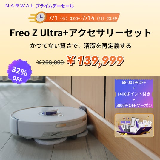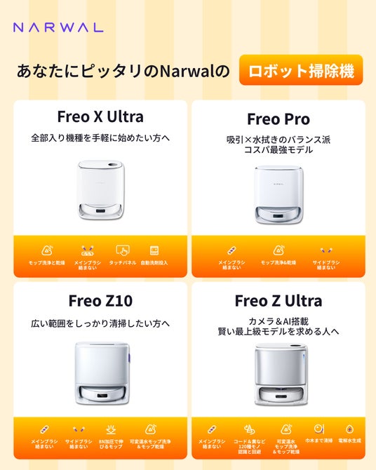 大幅割引となる人気製品「Freo X Ultra」「Freo Z10」、フラッグシップAI掃除機「Freo Z Ultra」、さらに家電批評のBestBuy受賞のスティック水拭き掃除機「S20 Pro」、高コスパの「Freo Pro」、そして各種アクセサリーなど、Narwal全製品が対象となります。