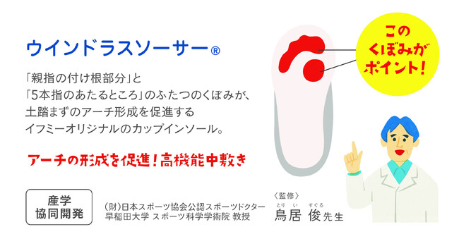 早稲田大学スポーツ科学学術院と産学連携で開発したIFMEオリジナルのカップインソール「ウィンドラスソーサー(R)」。「親指の付け根部分」と「5本指のあたるところ」にくぼみをつくり、土踏まずのアーチ形成を促進します。