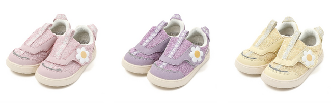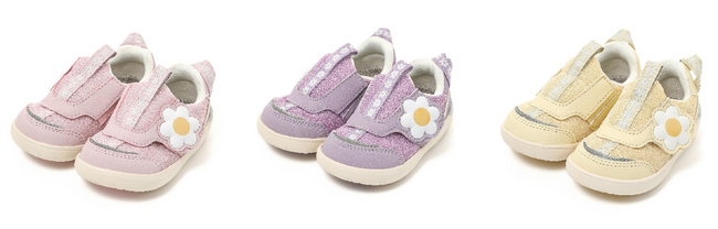 「ifme CALIN」からは、ベルト部分に大きなデイジーの花のモチーフをあしらった「ifme CALIN ビッグデイジー ifme patto スニーカー」を発売します。カラーは、お子様から人気の高いピンク・パープル・イエローの3色を展開。デザイン・色合いともに春のおでかけにぴったりです。