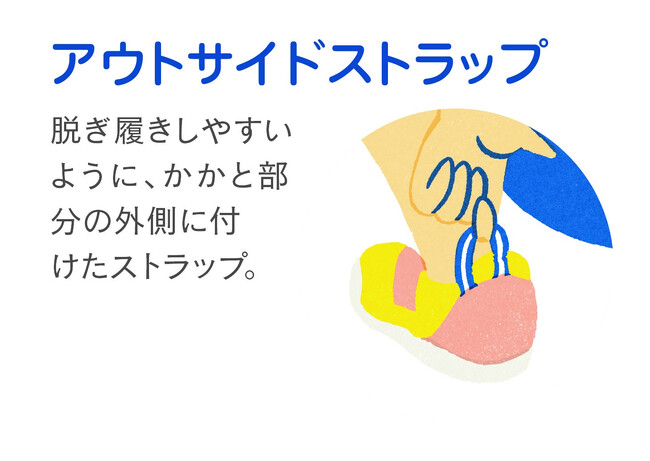 脱ぎ履きしやすいように、ストラップをかかと部分の外側につけたIFMEのオリジナル機能。