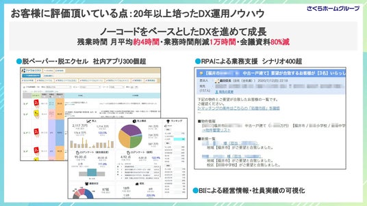 さくらホームグループでは、申請・報告・分析など多岐にわたる社内業務をノーコードで内製化し、情報共有の高速化・意思決定の質向上といった、実効性のあるDXの定着を全社的に進めています。