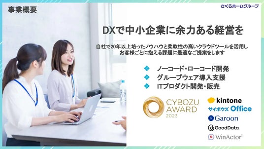 当社はこれまで、kintoneをはじめとするノーコードやクラウドツールを活用し、全国の中小企業に対する業務改善支援を展開してまいりました。導入支援やセミナー登壇、事例発信などを通じたDX推進にも積極的に取り組んでおります。特に、自社の成功実績に基づいた実践的な支援スタイルと、継続的な発信力・波及力は高い評価を受けております。