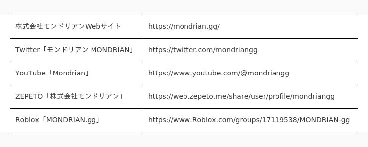 株式会社モンドリアンは、数億人規模のユーザーを抱える圧倒的な影響力を持つ4大プラットフォームを中心に、ゲーム・メタバースの法人・個人向けサービスを最前線で提供しています。国内外に業界トップクラスの6つの制作スタジオを形成し、単純に3Dモデルを納品するだけでなく、プランニングからコンテンツの作成、集客、運用までワンストップかつ柔軟に対応し、コミュニティやeスポーツ、メディアなどをも巻き込んだ立体的で蓋然性の高い戦略を打ち出すことで、ステークホルダーの勝率を最大化することを目指します。ゲーム・メタバース業界の先駆者として、サステナブルなエコノミー形成とメタバースのマスアダプションによるクリエイター支援を実施していきます。