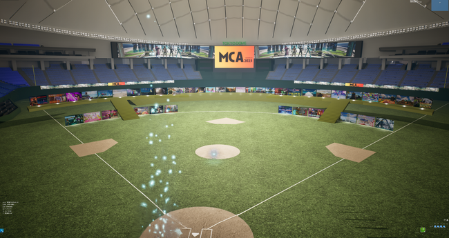 MCA2023 featuring Fortniteでは、参加するクリエイターの作品であるマップを繋ぐハブ部分に、東京ドームをモデルとしたワールドが登場しています。この東京ドームの入り口やグラウンドにクリエイターの作品紹介の看板が立つほか、グラウンド上に設置されたポータルから、一次審査を通過した方々の作品のマップに飛ぶことができます。