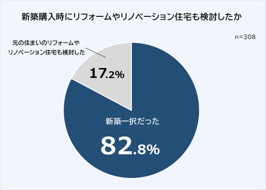 新築一戸建ての購入・建築時に「元の住まいのリフォームやリノベーション住宅も検討したか」を聞いたところ、検討した人は17.2%で少数派でした。新築一戸建てを購入する人は、検討段階で「新築一択」と決めていることが多いとわかります。