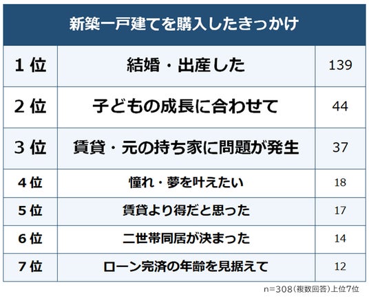 今回、一般社団法人あんしん解体業者認定協会(https://anshin-kaitai.or.jp/ )運営の解体無料見積ガイド( https://www.kaitai-guide.net/ )は、新築一戸建てを購入・建築した経験がある308人に「新築一戸建てを購入したきっかけ」についてアンケート調査を実施。その結果をランキング形式でまとめました。