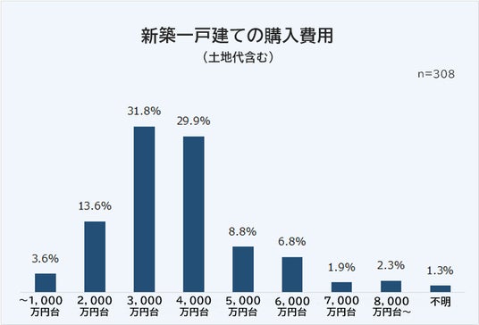 新築一戸建て購入の平均額は、土地付きで3,963万円となっています。ボリュームゾーンも3,000万円代~4,000万円代で、新築戸建て購入費用の相場は4,000万円前後と言えそうです。ただし地域や建物の大きさ、また注文住宅か建売住宅かによっても、購入費用は変わります。