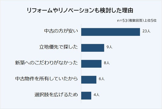 また住みたいエリアが限定されている場合、購入できる土地や建売が限られて見つけにくいこともあるので、選択肢を広げるために中古を検討した人もいました。