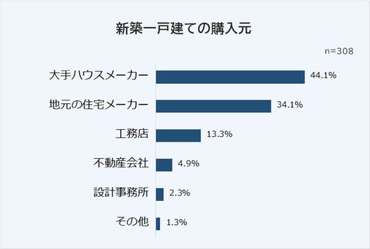 新築一戸建ての購入元は「大手ハウスメーカー」が44.1%で1位。2位は「地元の住宅メーカー(34.1%)」でした。