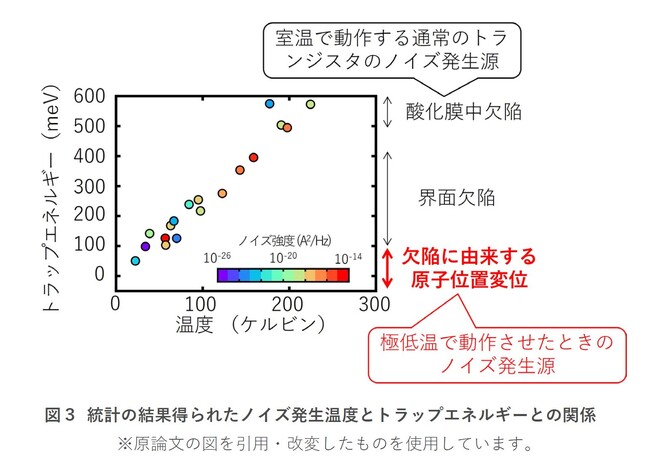 縞の様子(ノイズの各周波数成分の強度分布)を理論と比較することで、トラップエネルギーと呼ばれるノイズ発生の起源が固有に持つエネルギーを算出することができます。トラップエネルギーはノイズ発生の起源ごとに一意に決まるので、トラップエネルギーからノイズ発生の起源を特定することができます。図2で示したデータはある一つのトランジスタを測定したデータですが、別のトランジスタを測定すると縞の様子が異なるデータが得られます。そこで、多数のトランジスタを測定し、さまざまな縞のデータを取得してトラップエネルギーを算出し、統計をとります。統計をとったものが図3です。縦軸は算出して得られたトラップエネルギー、横軸はノイズが発生した温度になっています。結論として、室温に近い温度帯では酸化膜中の欠陥が主要なノイズ発生の起源であったものが、温度の低下とともに界面の欠陥が主要な発生の起源となり、極低温下ではこれらの欠陥に付随する微小な原子位置の乱れが主要なノイズ発生の起源になっていくことを明らかにしました。