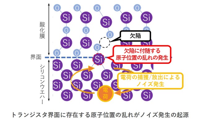 室温下でノイズ発生の起源となっている酸化膜中の欠陥は、酸化膜中の原子が一つ抜けたものです。同様に、界面欠陥も界面にあるべき原子が一つ抜けたものです。このように原子一つが抜けて欠陥ができると、それに付随して周りの原子がわずかに動き、原子位置が乱れます。これは両手をそれぞれつないでバランスをとっているときに、片方の手を離すとバランスが崩れて動いてしまうようなものです。酸化膜中の欠陥、界面の欠陥および原子位置の乱れは、電流を流している電荷を捕獲したり放出したりします。これによって電流が変動、ノイズが発生することになります。原子位置の乱れは、トランジスタを室温で動作させる場合にはノイズへの影響はほとんどありませんでした。しかし、今回の研究成果によって、極低温で動作させる場合にはこのような微小な原子位置の乱れまで考慮する必要があることがわかりました。