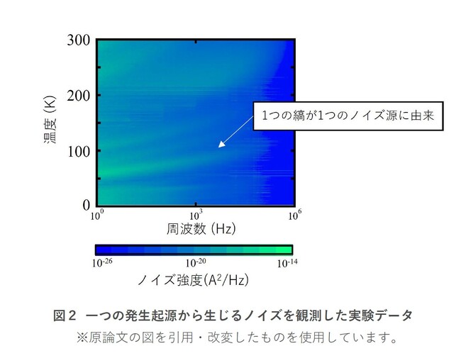 特定に至らなかった理由は、このときに用いたトランジスタが大型のものであり多数のノイズ発生の起源からの平均したノイズを観測していたことにあります。そこで今回の研究では、ノイズ発生の起源がごく少数のみ含まれるような微細なトランジスタを用いました。これにより、一つの発生の起源ごとに生じているノイズを区別して観測することに成功しました。図2は、ある一つの微細トランジスタで発生したノイズの1~106ヘルツの範囲の周波数成分の強度を、絶対温度300ケルビン(摂氏27度)から3ケルビン(摂氏マイナス270.15度)までの温度範囲で1度ずつ温度変化させながら測定したデータです。この縞(横線)一つ一つが、各温度で発生したノイズのデータです。