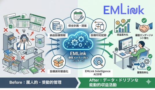 設備管理クラウドサービス「EMLink」を提供する株式会社設備保全総合研究所(本社:東京都目黒区、代表取締役CEO:相原章吾、以下「EML」)は、産業機械・各種機器メーカーのアフターサービス業務に特化した「EMLink 機器メーカー向けパッケージ」の提供を開始いたします。本パッケージにより、機器メーカーは納入済み機器の保全計画・顧客対応・部品管理・提案活動を一元管理でき、アフターサービスの収益最大化と業務効率化を同時に実現できます。