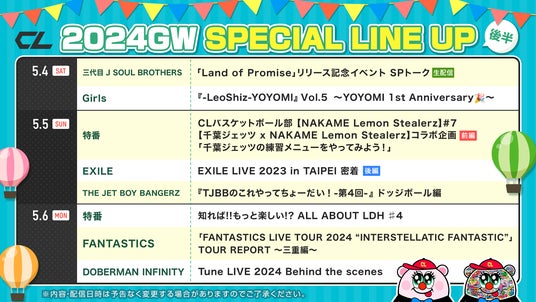 ※内容は予告なく変更になる可能性がございます。株式会社CyberLDH(本社:東京都渋谷区、代表取締役会長:森雅貴、代表取締役社長:藤田晋)は、LDHのコンテンツをお楽しみいただけるデジタルコミュニケーションサービス「CL(読み:シーエル)」にて、GWのスペシャルラインナップを発表いたしました。その中から注目のラインナップをご紹介します。【5月4日(土)】