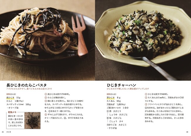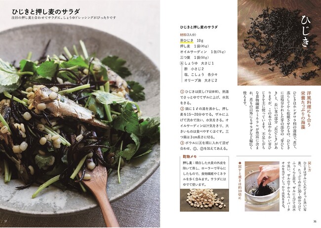 ひじきはホンダワラ科の海藻で、煮て、蒸らしてから乾燥させたもの。ひじきには枝分かれした芽の部分の”芽ひじき”と、長い茎の部分”長ひじき”がありますが、この本ではやわらかい芽ひじきを主に使っています。不足しがちな食物繊維やミネラルが豊富に含まれ、煮もの以外にもサラダなど幅広く使えます。