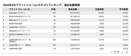 2025年4月に実施されたクラウドファンディングの達成金額ランキングTOP5では、支援額・支援者数・平均単価・達成率の各データが以下のように発表されました。