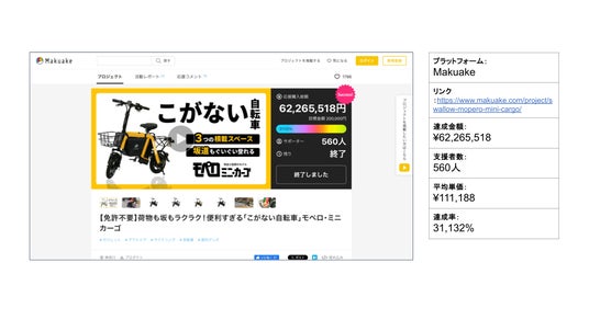 2025年4月のクラファン達成額TOP5は、1位のAIスマートリングを含む4件がMakuake、1件がGREEN FUNDINGから登場しました。中でも「こがない自転車」は平均支援額11万円超にも関わらず560人の支援を集め、高価格帯でも訴求力のある商品が支持されていることが分かります。プロダクト系が多くを占め、利便性や生活向上を軸にした設計が成功要因といえます。