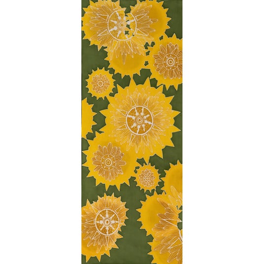 夏の強い日差しのなか、太陽の光とそれに向かって輝くひまわりのイメージを描きました。