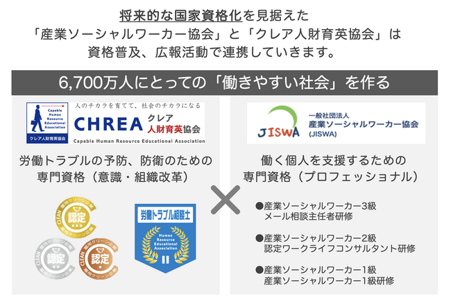 労働人口6,700万人にとっての働きやすい環境を作るため、事業提携します。今後は両団体の理事、講師、有識者と共同した広報活動による相互発信を始め、資格受講時の割引特典などを検討していきます。
