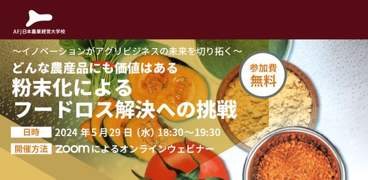 今回は2024年5月29日(水)に、色・香り・栄養成分を保持したままに農産物を粉末化する高い技術力で世界のフードロス問題の解決を目指す、株式会社グリーンエースの中村 慎之祐 社長から、フードロス問題の現状、同社のこれまでの歩みとこれからの取組み等についてお話しいただきます。