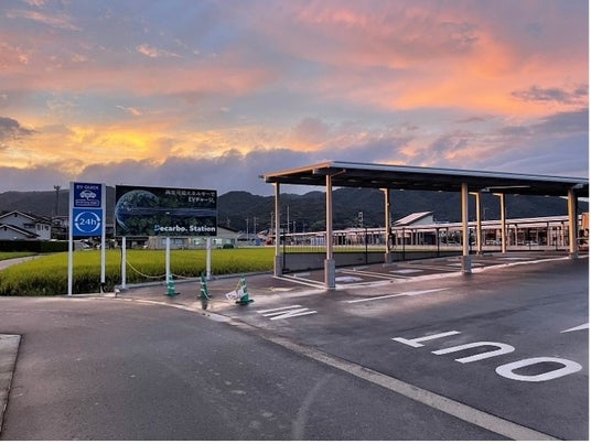Decarbo. Stationは、2023年9月から運営を開始している国内最大級のEV充電ステーションです。太陽光発電システム及び蓄電システム、洗車設備を併設しており、EV充電の電源はすべて再生可能エネルギーで賄っています。