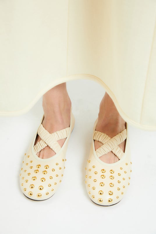「ジューン バレリーナ」は、クラシックなバレリーナシューズに施されたエッジの効いたスタッズが、日常の装いに特別なアクセントをもたらします。上質なレザーと絶妙なフィット感により、快適さとスタイルを両立します。