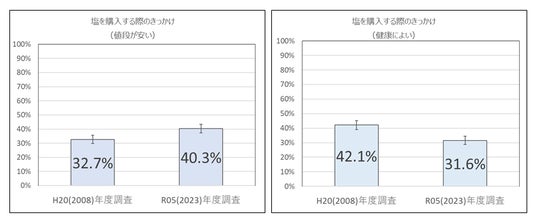 「塩を購入するきっかけ」の質問では、「値段が安い」が伸びており、値段が重視されるようになってきていることが伺えます。一方で「健康に良い」は、減少しています。