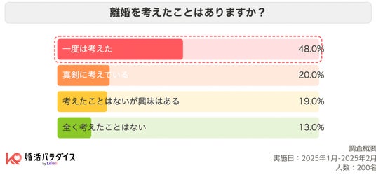 「一度は考えた」が96名と半数近くにのぼり、さらに「真剣に考えている」も40名と、合計すると約68%が離婚を具体的に思案した経験がある結果になりました。