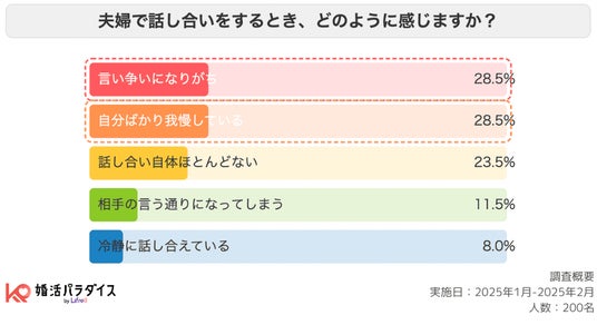 「冷静に話し合えている」は16名と非常に少ない結果となり、多くの夫婦が建設的な話し合いに課題を抱えているようです。