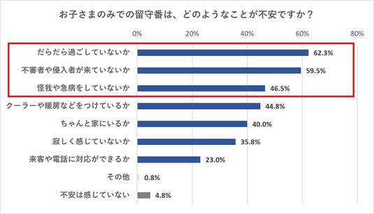 具体的にどのような不安を感じるかについて伺うと、「だらだら過ごしていないか」(62.3%)、「不審者や侵入者が来ていないか」(59.5%)の2つが過半数を超え、続いて「怪我や急病をしていないか」(46.5%)という結果となりました。