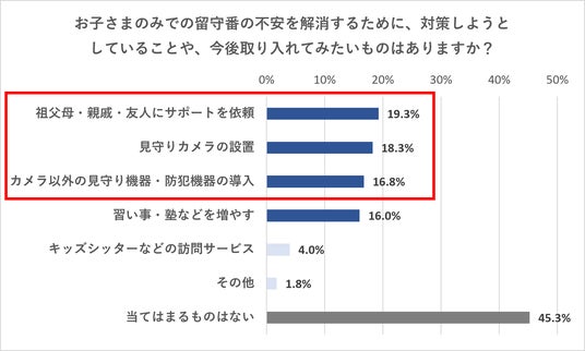 今後取り入れてみたい子供だけでの留守番の不安の解消方法について聞いたところ、「あてはまるものはない」(45.3%)を除くと、「祖父母・親戚・友人にサポートを依頼する」(19.3%)、「見守りカメラの設置」(18.3%)、「カメラ以外の見守り機器・防犯機器」(16.8%)が上位にランクインしました。