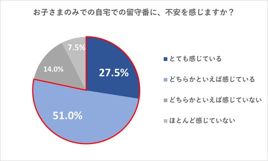 お子さまだけでご自宅で留守番することに不安を感じるかどうかという質問には、「とても感じている」と回答した方が27.5%、「どちらかといえば感じている」と回答した方が51.0%という結果に。「とても感じている」「どちらかといえば感じている」と回答した方を合わせると、78.5%もの親御さまがお子さまのみでのお留守番に不安を感じていることがわかります。