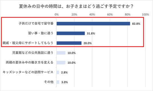 お子さまが普段であれば通学している、夏休みの日中の時間はどのように過ごすかを伺うと、「子どもだけで自宅で留守番」と回答した方が最も多く、82.8%に上りました。次いで、「習い事・塾に通う」(31.8%)、「親戚・祖父母にサポートしてもらい、一緒に過ごす」(28.0%)が上位にランクインしました。