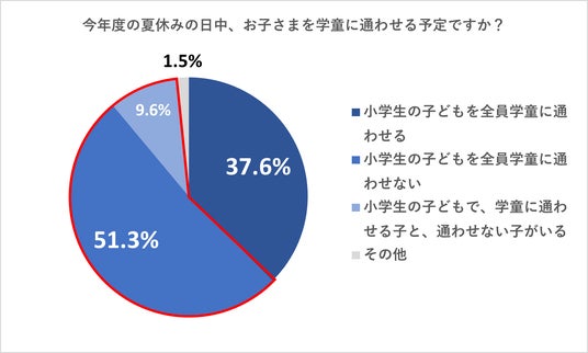 まず、小学生のお子さまをもつ方に、今年度の夏休みに学童を活用するかどうか伺いました。結果、「小学生の子どもを全員学童に通わせない」が51.3%、「小学生の子どもで、学童に通わせる子と、通わせない子がいる」が9.6%という回答となりました。