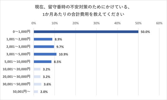 留守番時の不安対策にかけている金額は、何らかの対策をしている方の中でも、0~1,000円が50.0%と最も多い結果となりました。次点で、「3,001~5,000円」(10.9%)、「2,001~3,000円」(9.7%)が多い結果です。「10,001円~」の回答を合算しても12.1%となっているため、月に10,000円が不安解消のための費用の基準であると伺えます。