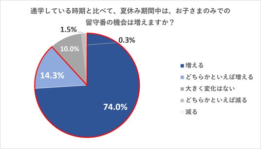 夏休み期間中にお子さまの留守番機会が増えるか聞いたところ、「増える」と回答した方が74.0%、「どちらかといえば増える」と回答した方が14.3%という結果となりました。