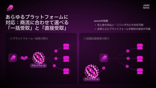 こうしたニーズを受け、Jammは今回、複数の事業者・販売主体が関与する商流にも対応できるよう、プラットフォーム事業者向け機能の提供を開始しました。
